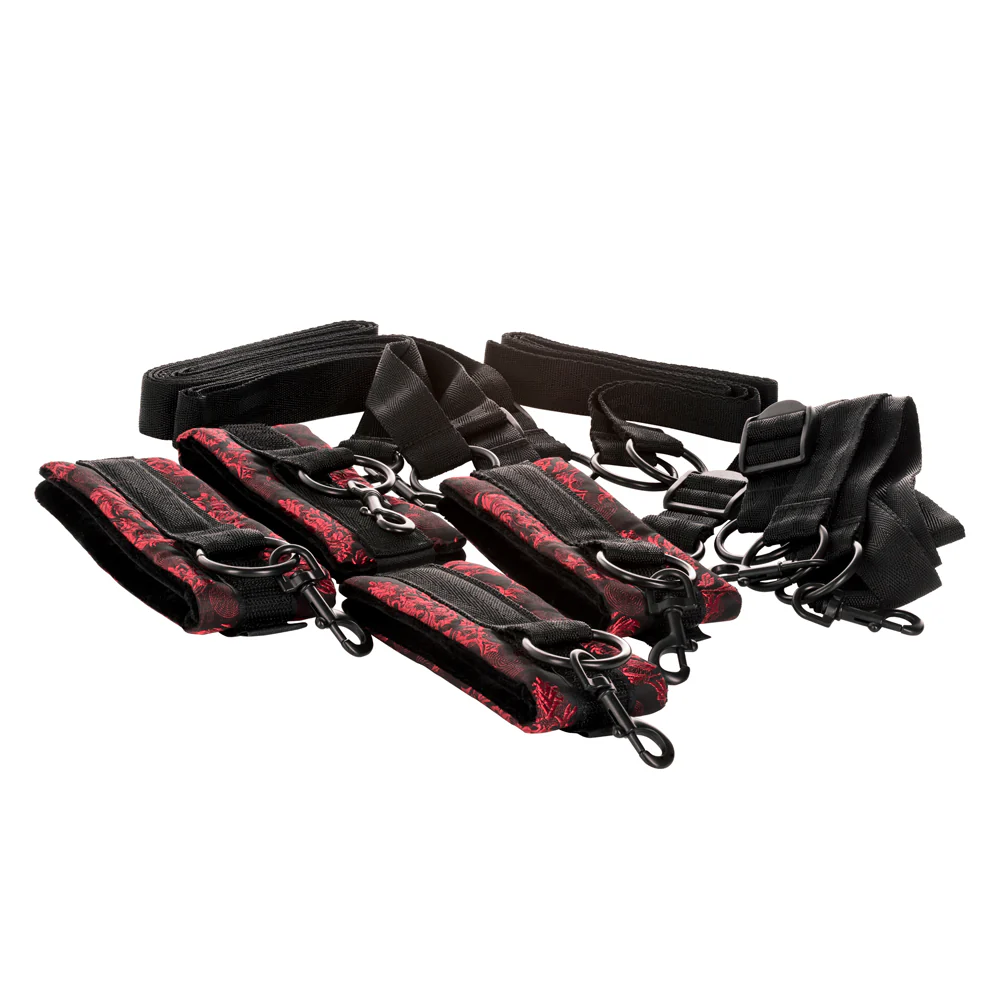 Sink into the sensations of total immobility and relinquish your control to a lover with Scandal’s® Bed Restraints Wrist & Ankle Cuff Bondage System!